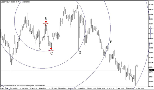 Gráfico diario del USDJPY desde noviembre ’09 a septiembre ’10. La perfecta simetría del mercado se puede apreciar con el centro de la espiral en el punto B y comenzando en el punto C.