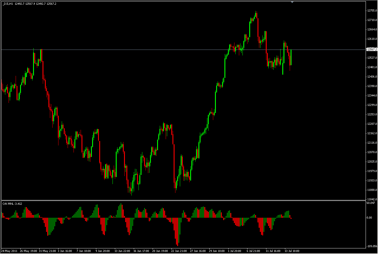 El histograma del Oscilador de Aceleración/Desaceleración MNL (OA MNL) es la diferencia entre el histograma del impulso del Oscilador de Momento MNL 5/35 y un promedio móvil simple de 5 barras en el Oscilador de Momento MNL.